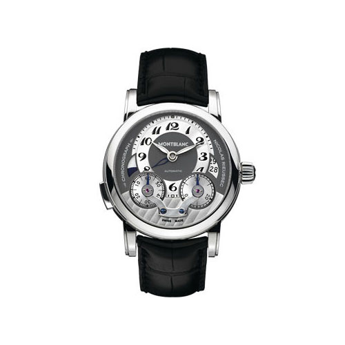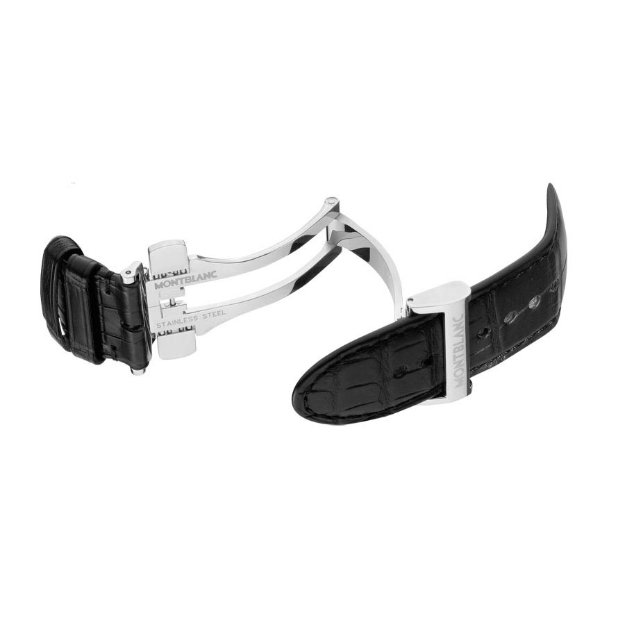 43 mm watch with stainless steel case, Montblanc Calibre MB R200, monopusher chronograph with automatic winding, anthracite-coloured dial with applique hour circle, date display, second time zone with day/night display, chronograph counters with rotating discs.